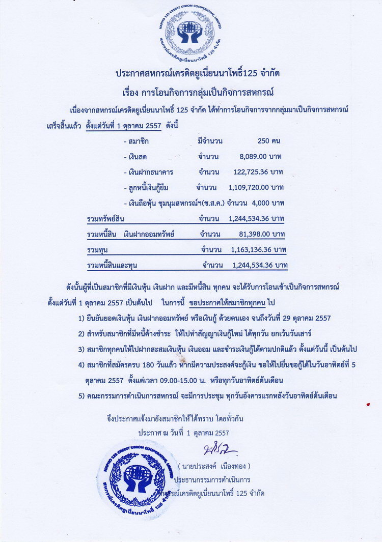 เรื่องที่ ๖ การโอนกิจการของกลุ่มฯ-รับเป็นกิจการสหกรณ์เครดิตยูเนี่ยนนาโพธิ์ 125 จำกัด