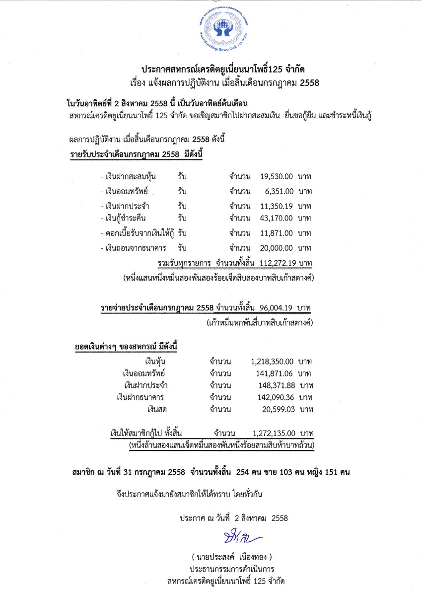 รวมประกาศต่างๆ สหกรณ์เครดิตยูเนี่ยนนาโพธิ์ 125 จำกัด